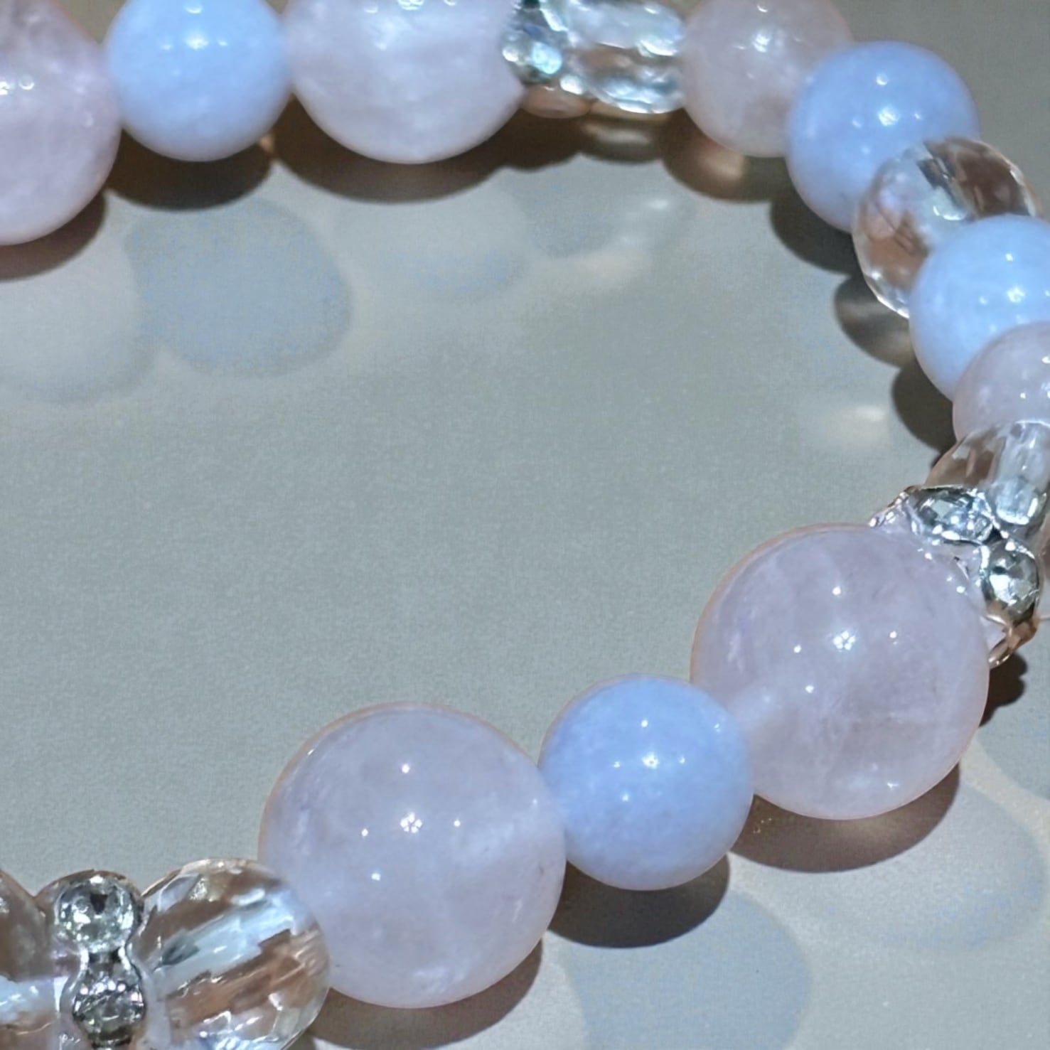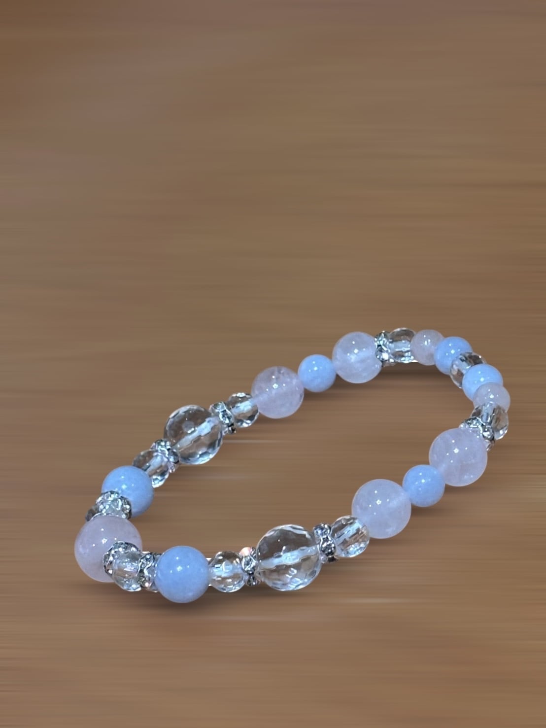 人とのつながりに穏やかな調和をもたらしてくれると言われる、ローズクォーツ・アクアマリン・水晶を組み合わせた天然石ブレスレットです。